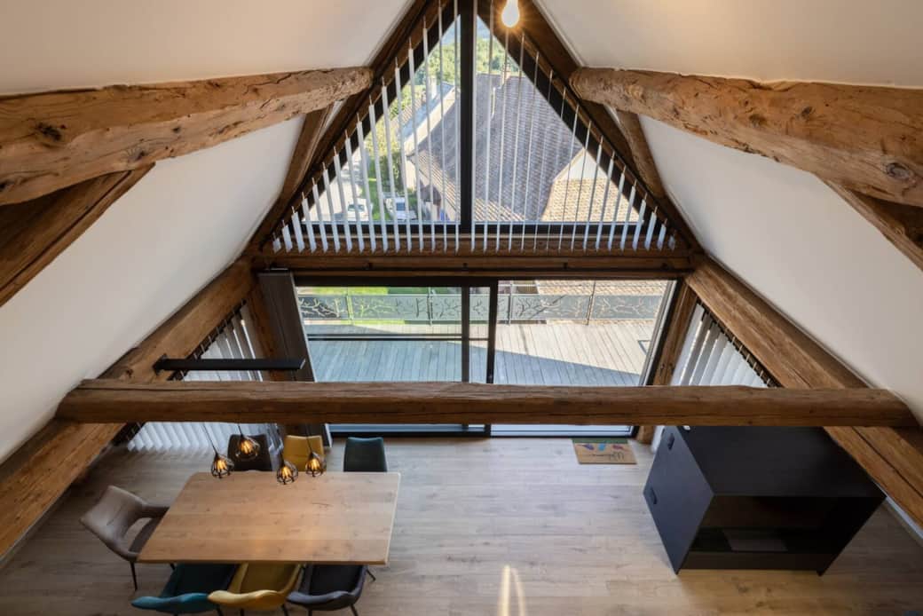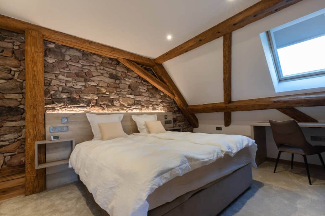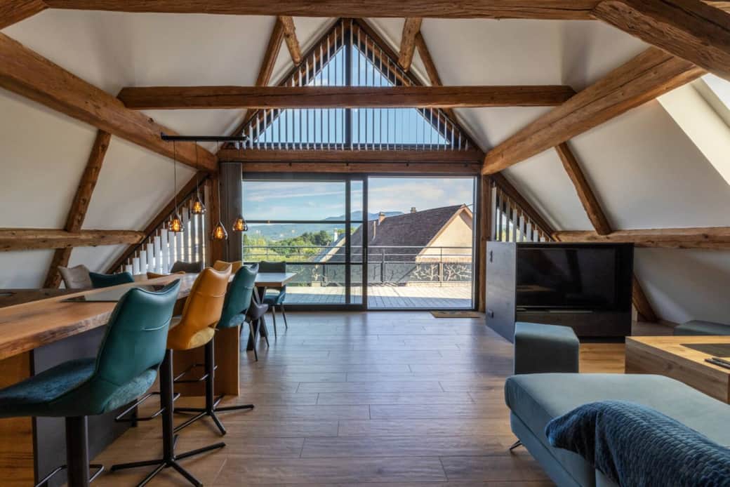 Bienvenue au Lorenz Home, un appartement d’exception perché sur les hauteurs de Neuve-Église, au cœur de la Vallée de Villé. Cet espace unique de 120 m² séduit par sa vue panoramique sur les montagnes et son ambiance à la fois moderne et chaleureuse. Vous profiterez d’une cuisine entièrement équipée, d’un séjour lumineux avec un pan de façade vitré, et d’une décoration soignée mêlant bois, pierre et design contemporain. Les deux chambres principales offrent de superbes murs en pierre apparente, une literie haut de gamme et une atmosphère apaisante.
